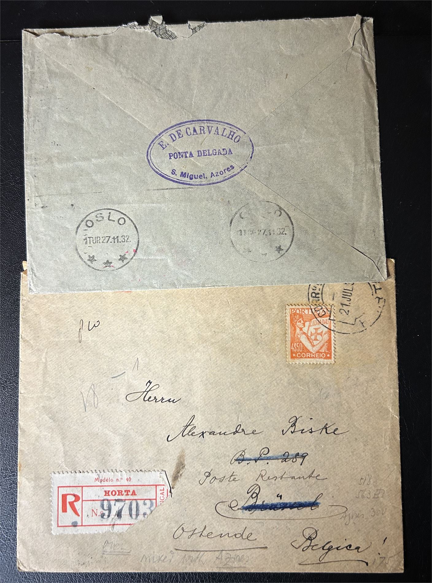 PORTUGAL/ACORES Brev til Oslo 1927 og Belgia 1937. Det ene med portugisisk frimerke