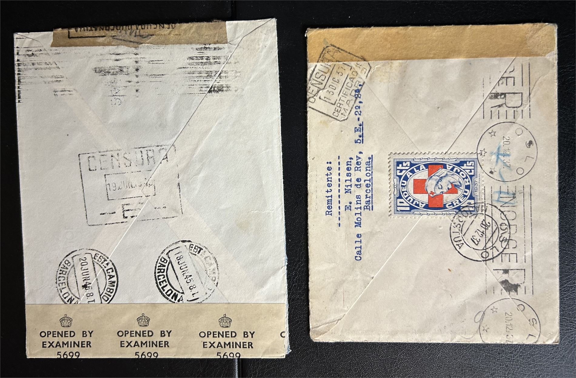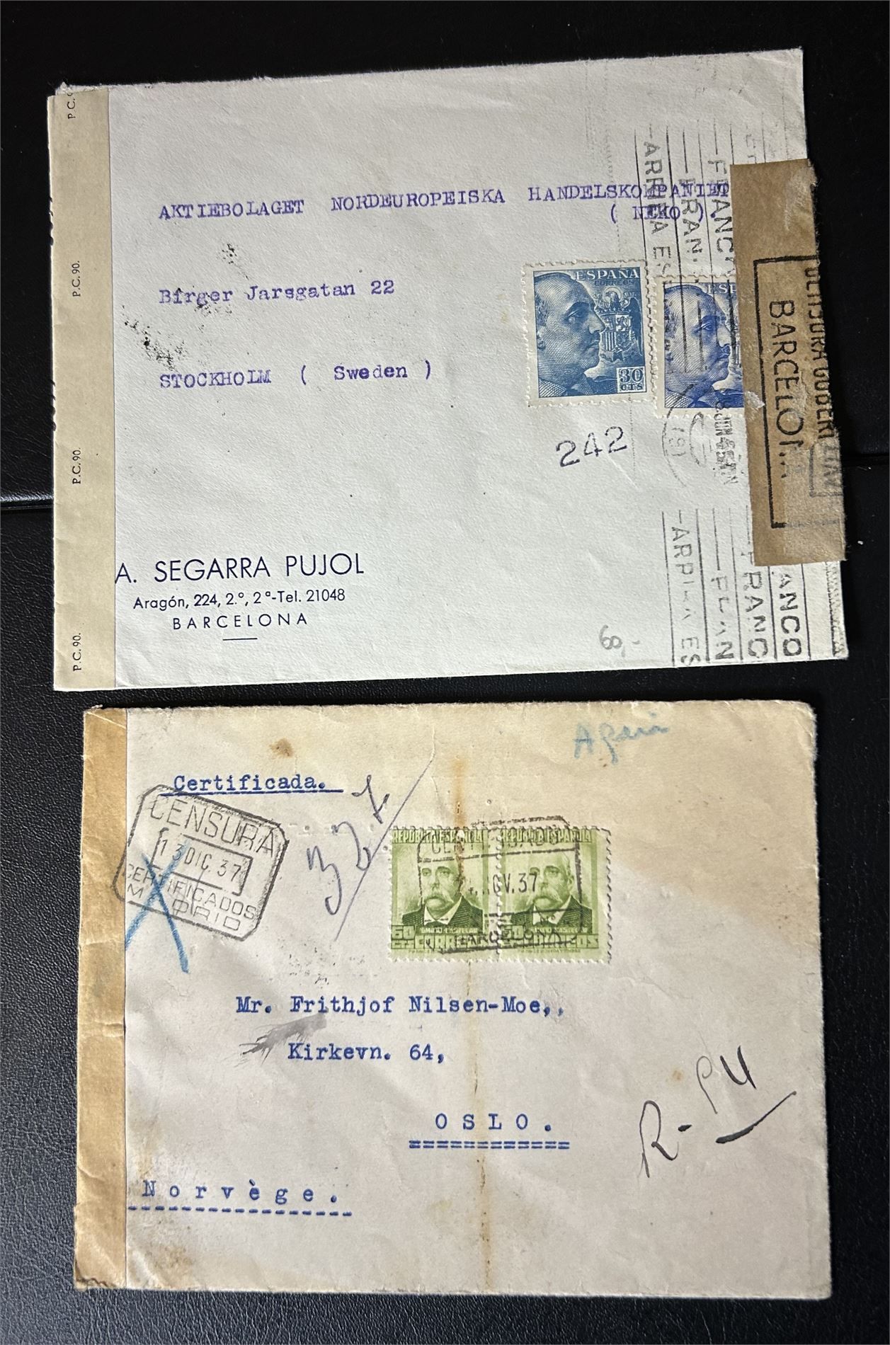 SPANIA-BREV 2 sensurbrev 1937 til Oslo og 1945 til Stockholm