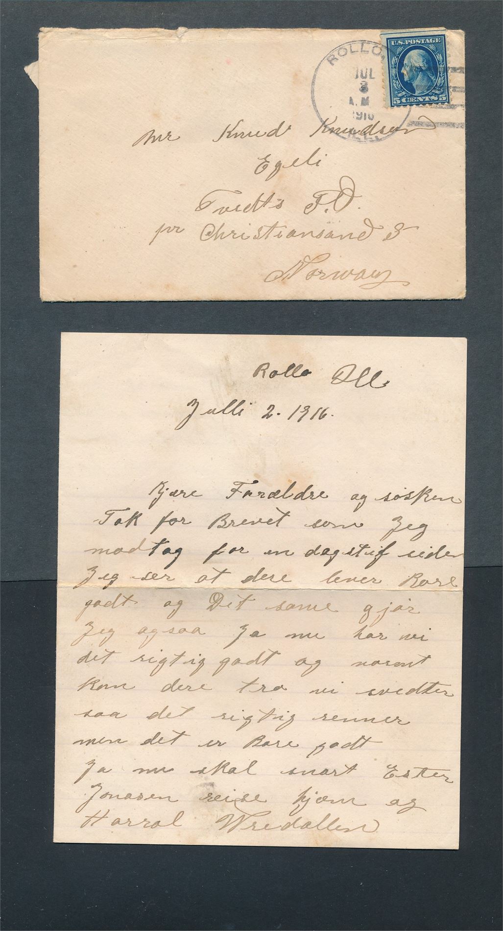 USA-AMERIKABREVET Brev til Tveit stemplet "ROLLO, ILL JUL 2 1916". Fullt innhold