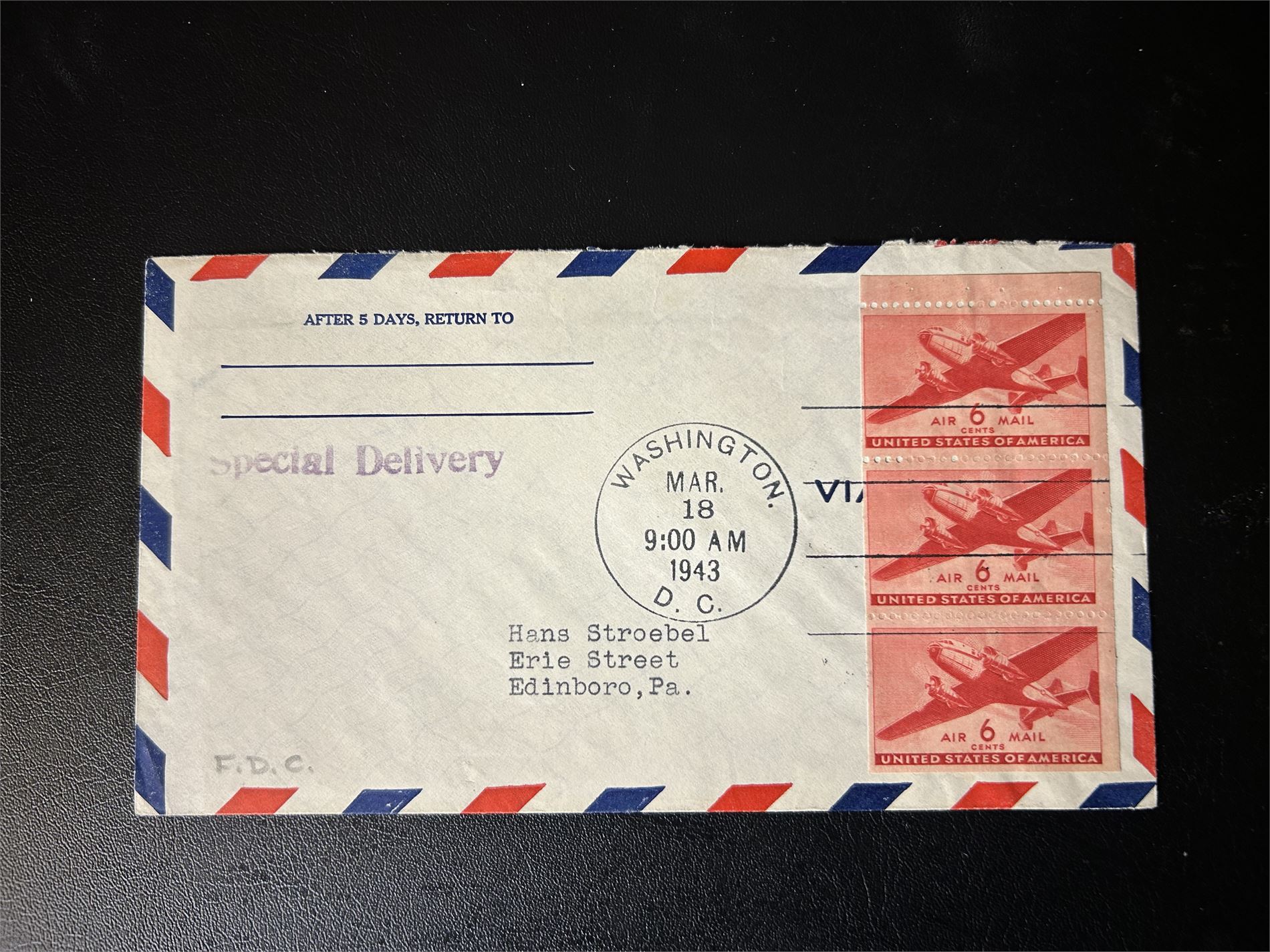 USA-BREV Special Delivery med 6c luftpost 3-stripe fra hefte stemplet "WASHINGTON DC MAR 18 1943"