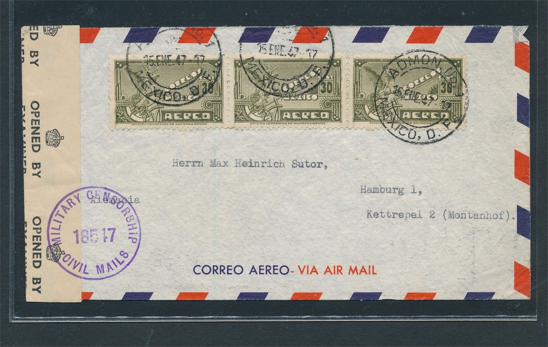 MEXICO Sensurbrev til Hamburg stemplet "ADMON No. 1 15 ENE 47"