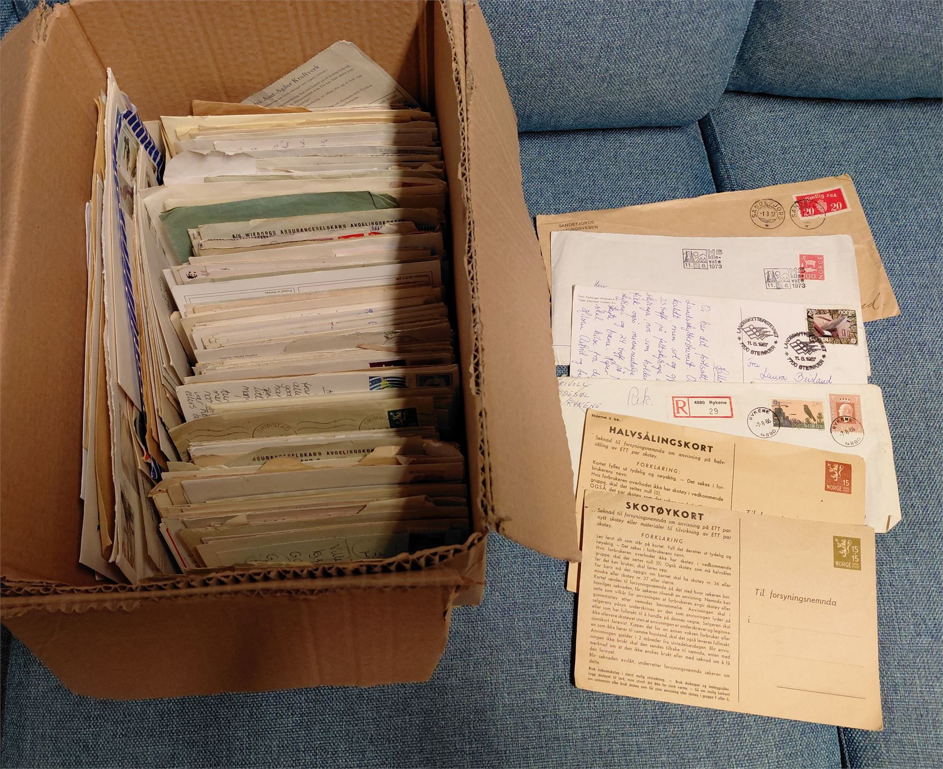 BREV Eske med hovedsaklig norske brev og kort ca 1920-80. Nesten alt til samme adresse i Grimstad, med 60-70-tallet. Vekt 2,9 kilo