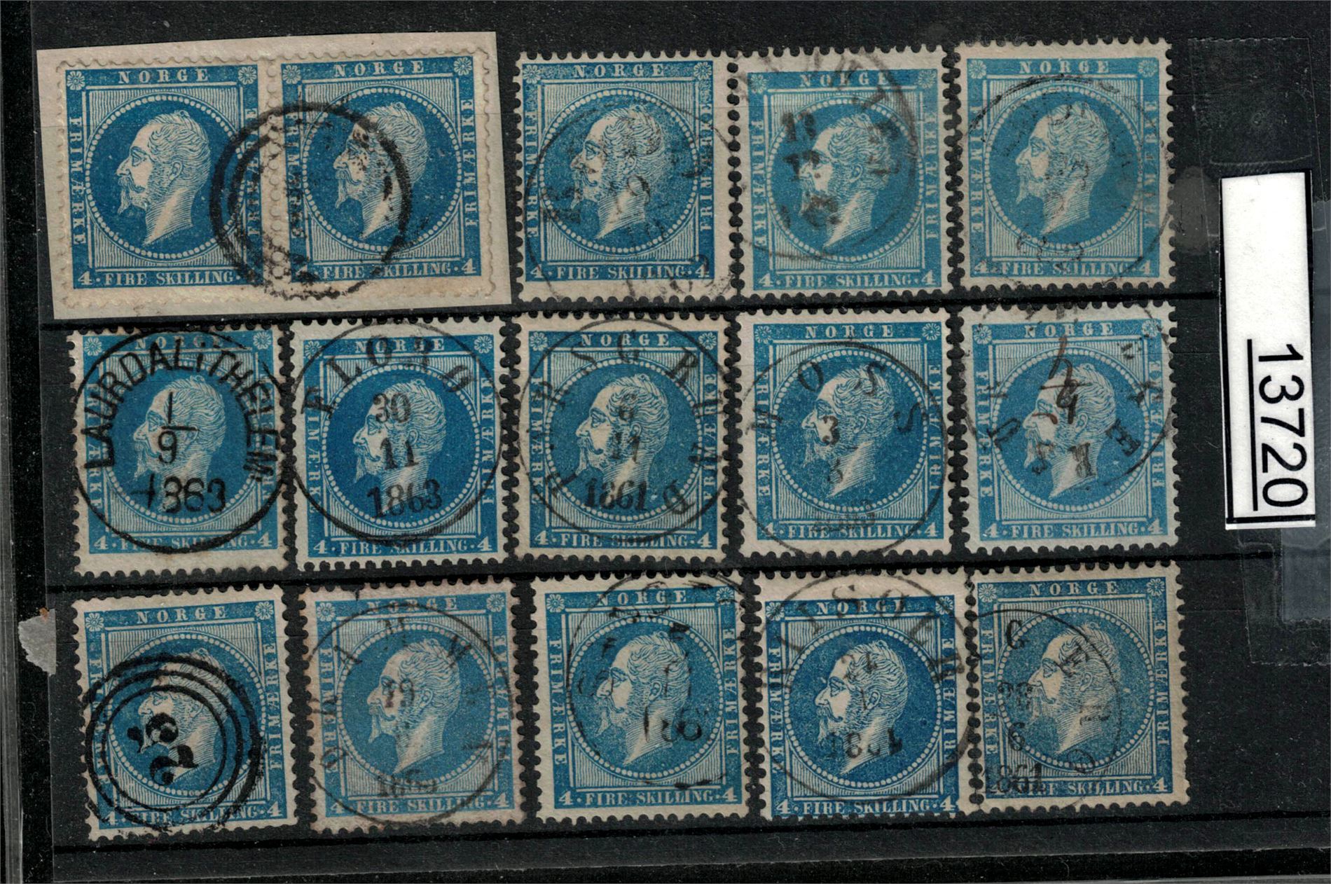 Nk 4 o. 15 merker inkl pent "LAURDAL I THELEM. 1-9-1863" + et med platefeil og et med variant 3