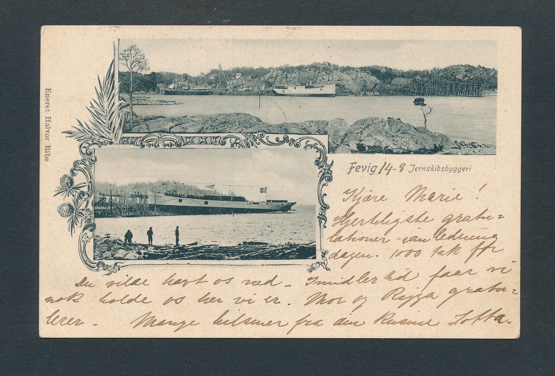 FEVIG JERNSKIBSBYGGERI (Halvor Ribe) stemplet "ARENDAL 14 VIII 03"