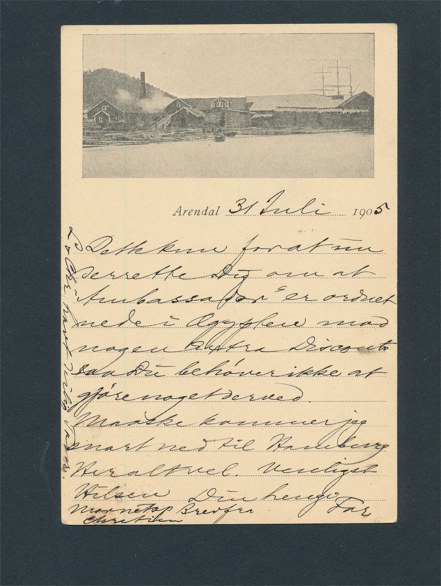 ARENDAL (C. B. Evensen) Udelt bakside, sendt til Hamburg 1905