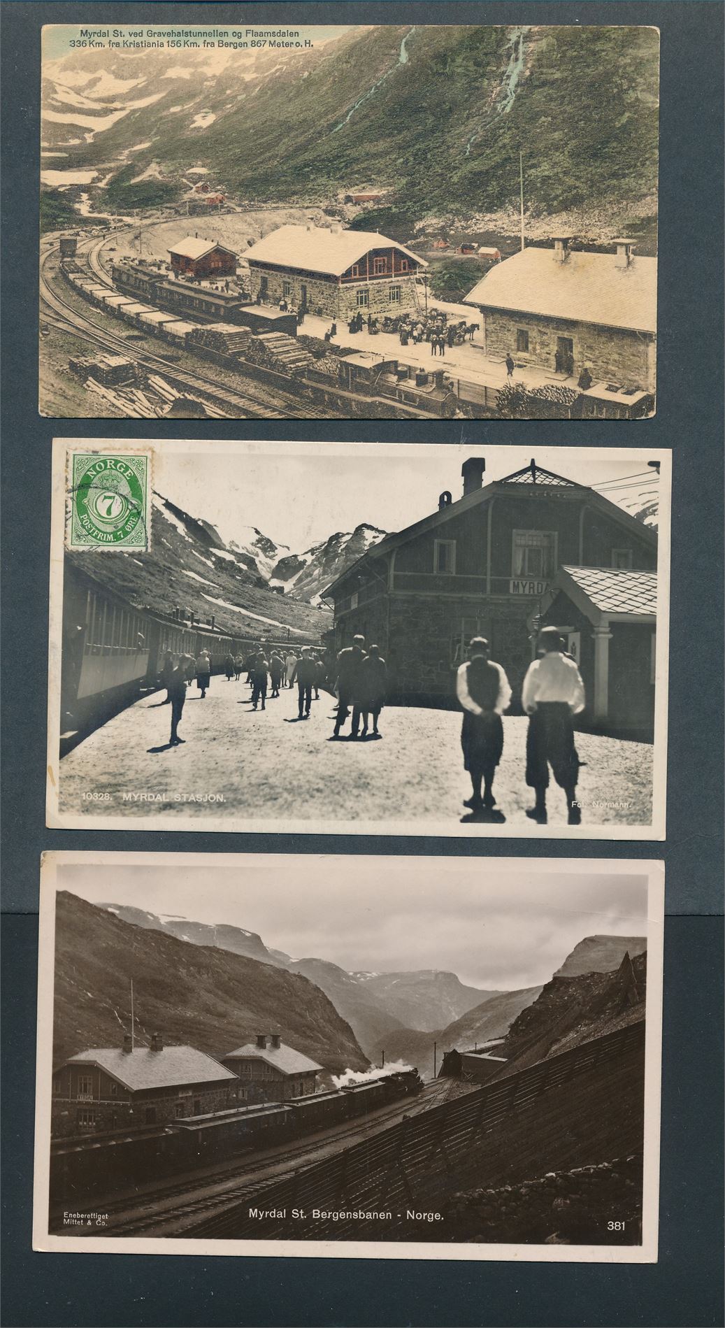 JERNBANESTASJON-MYRDAL 3 kort, et i farger brukt 1912, et brukt 1932 og et ubrukt