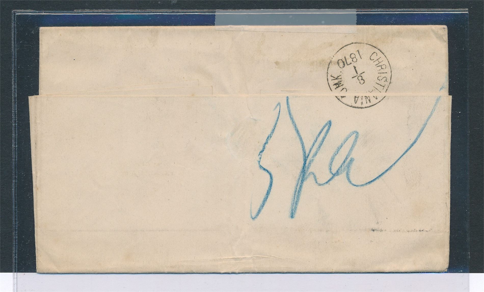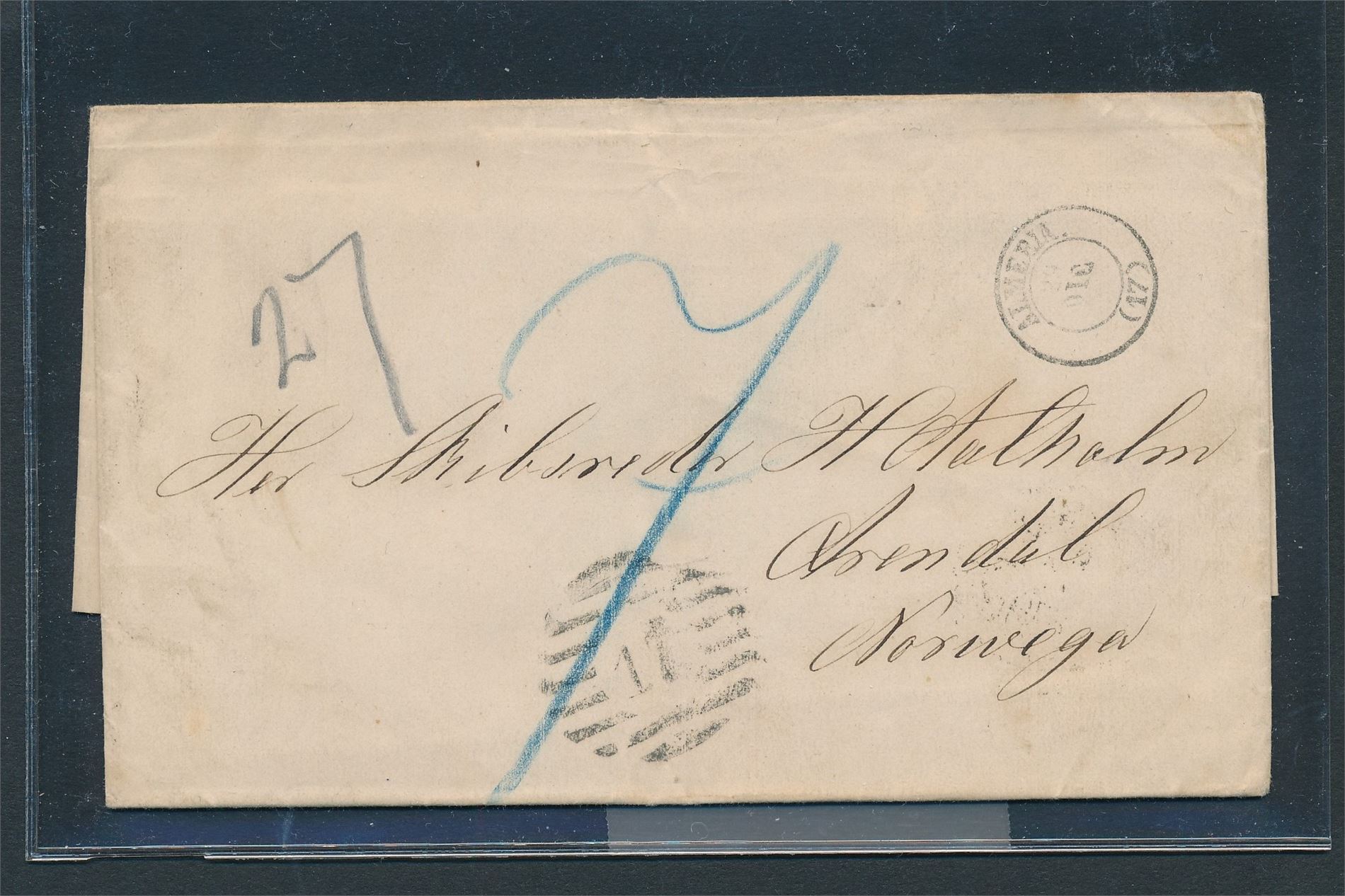 Brev sendt stemplet "ALMERIA 29 DIC 1869" (Spania) til skibsreder Aalholm i Arendal. Et nummerstempel "17" foran, bak "CHRISTIANIA OMK 8-1-1870". Bra brev
