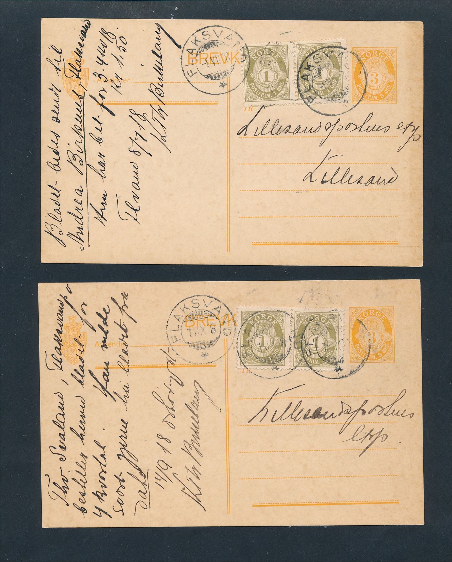 2 oppfrankerte helsaker stemplet "FLAKSVAND"