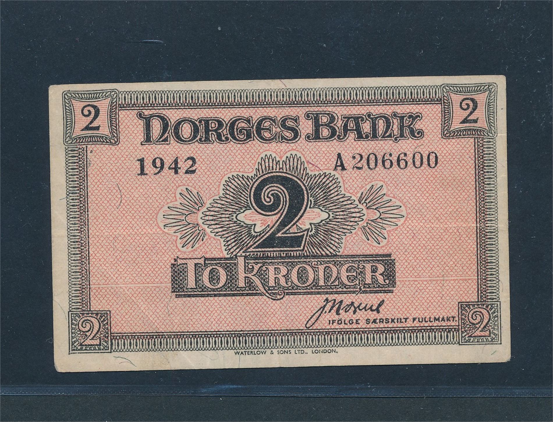 PENGESEDDEL 2 kr Londonseddel 1942. Pent brukt, opplag ukjent. Ettertraktet!