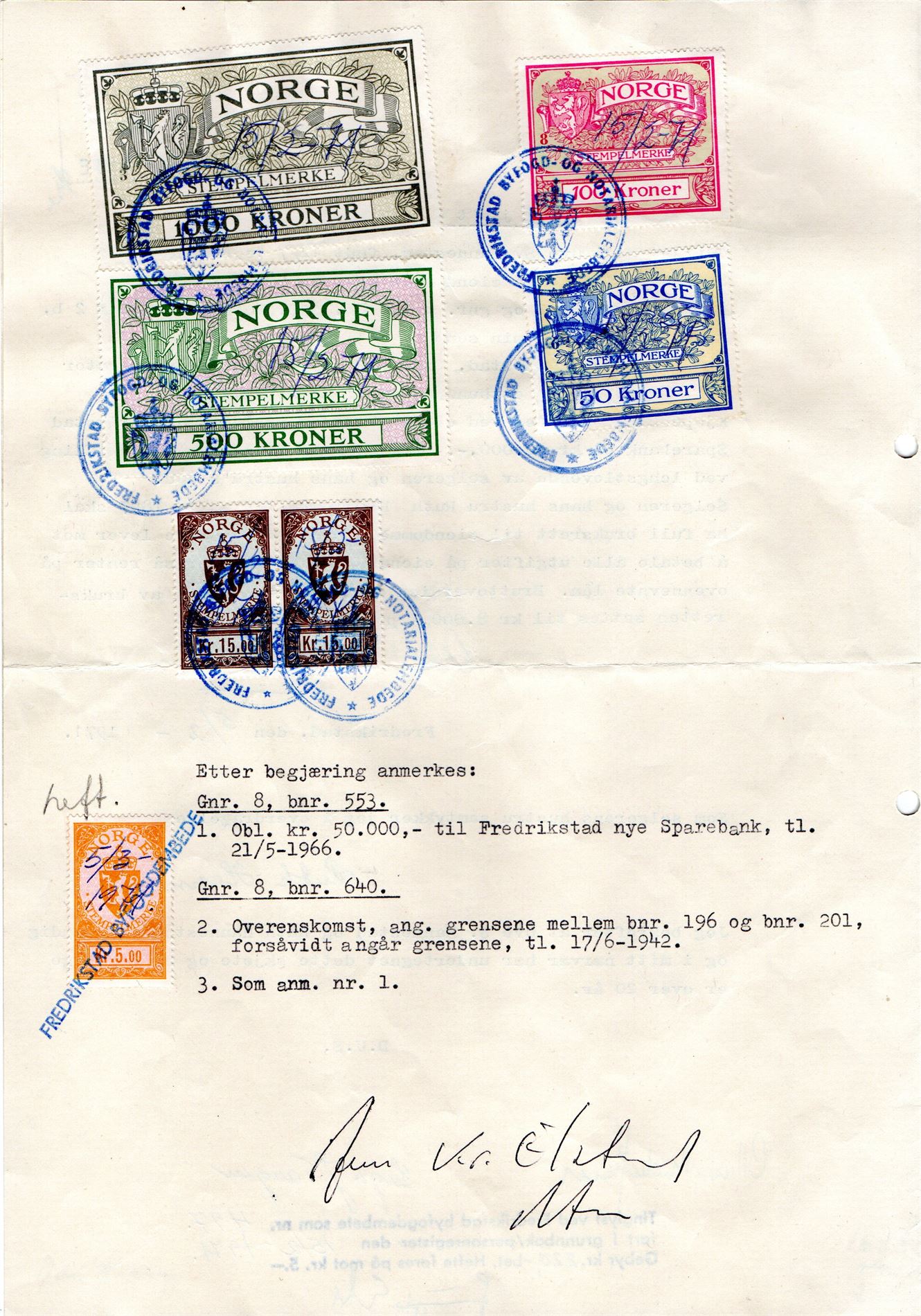 7 stempelmerker på skjøte fra 1971. Stemplet Fredrikstad byfogdembede og Fredrikstad byfogd- og notarialembede. Valærer 5 kr, 2x 15kr 50 kr, 100kr 500kr og 1000kr. Sjeldent.