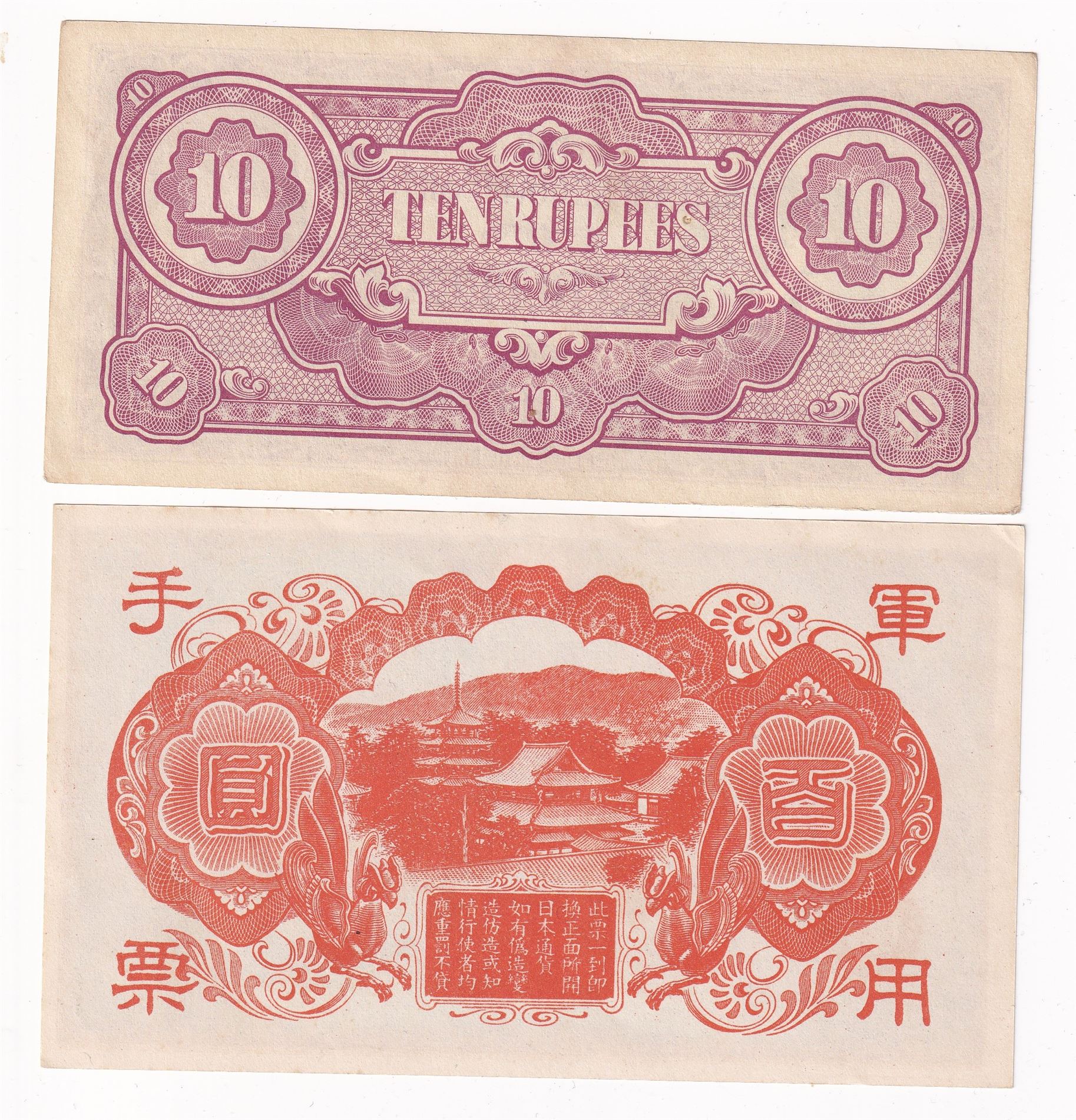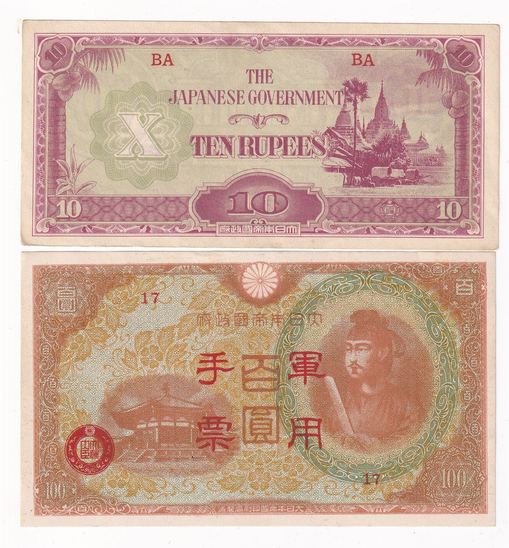 Burma 1942-44 10 rupees (P16), 100 yen 1945 Japan (for bruk I Kina,M30)