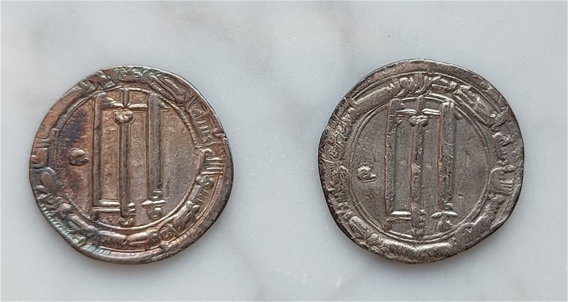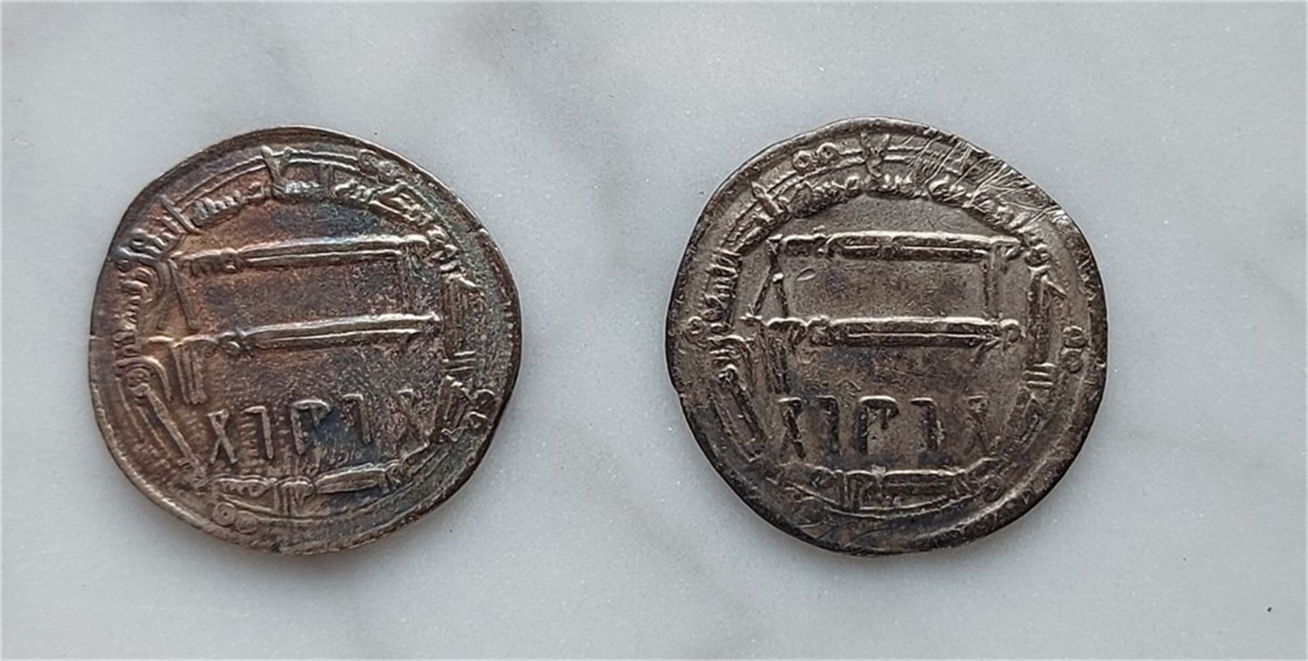 193 H. Kufisk inskrift inom cirkelramar. Cirkulerade exemplar med slitage, patina och mindre korrosionsinslag. (Ahlström proveniens)